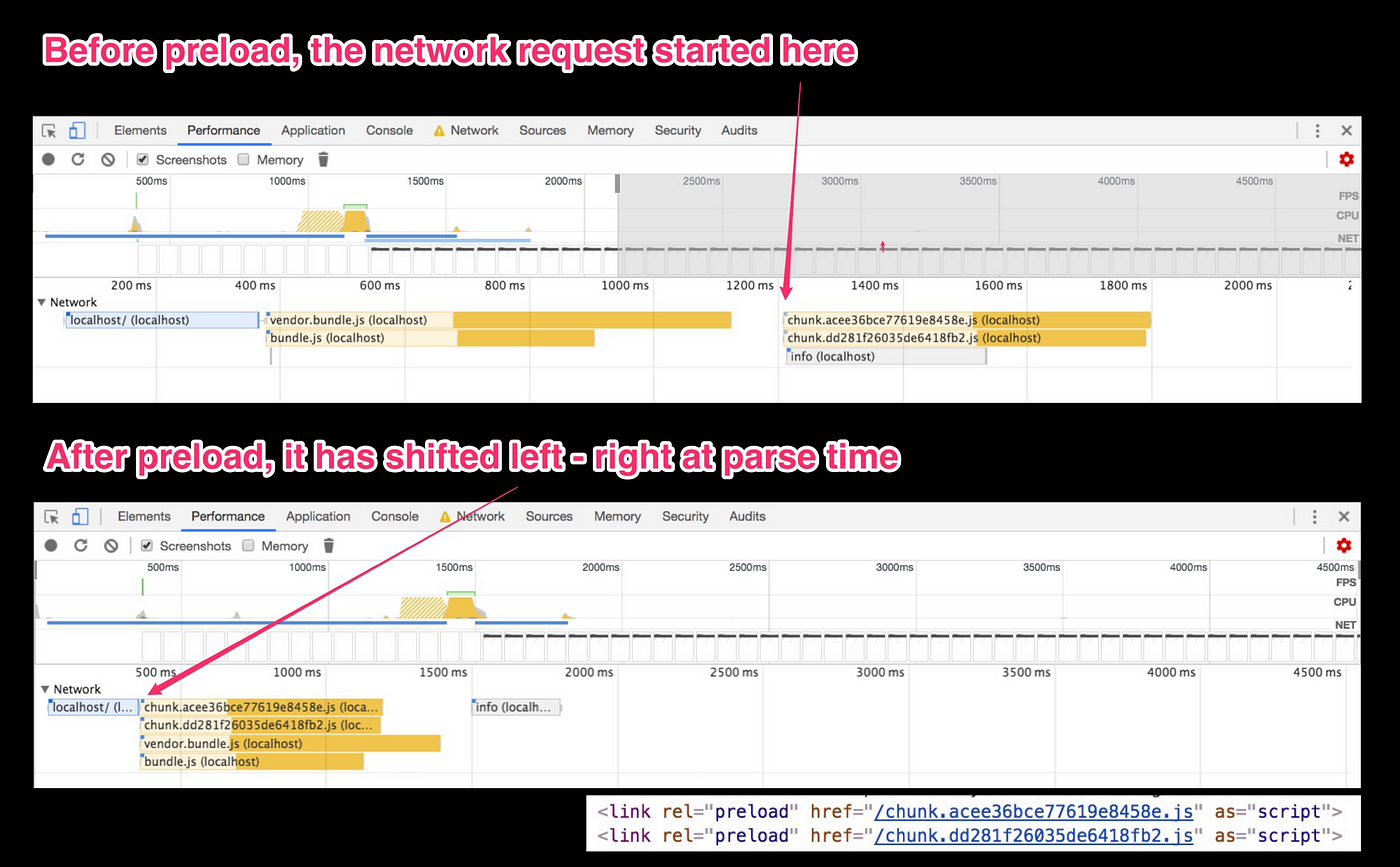 ⚠️ preload link들을 어떤 형태로든 사용해도 되지만 짚고 넘어가야할 부분이 있다. 많은 서버들은 HTTP header form 내의 preload link를 본 후 http/2 server push를 시작한다. 의도치않게 push들을 trigger하지 않도록 HTTP header 대신 preload link tags를 사용하거나 header에 ‘nopush’ atttribute를 추가함으로써 원하지 않는 push를 보내는 것을 방지할 수 있다.