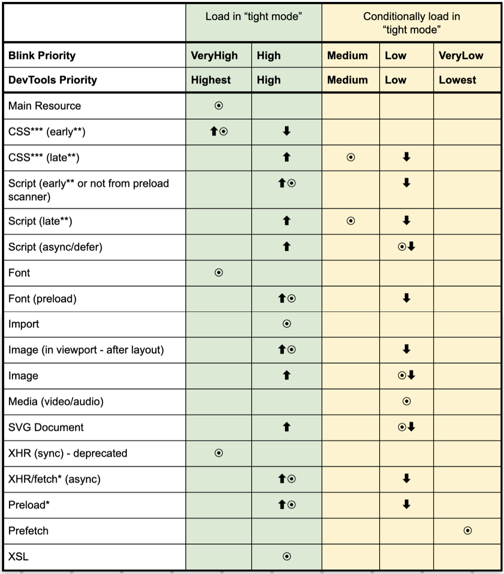 첫 번째는 Tight mode, 그 이후는 로딩 단계이다. 본문(Body)이 문서에 연결될 때 까지(모든 head 내부 스크립트가 실행된 후) 낮은 우선순위 리소스를 로딩하는 걸 제한한다. 낮은 우선순위 리소스는 해당 리소스가 발견된 시점에 처리 중인 요청이 2개 미만인 경우에만 로드된다.