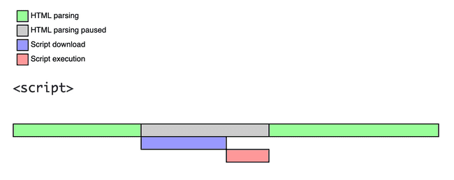 HTML을 파싱하면서 <script> 태그를 만나게 된다면 DOM 생성을 중지시키고 JS 엔진에게 제어 권한을 넘겨 JS를 실행시킨 후 나머지 HTML을 파싱한다.