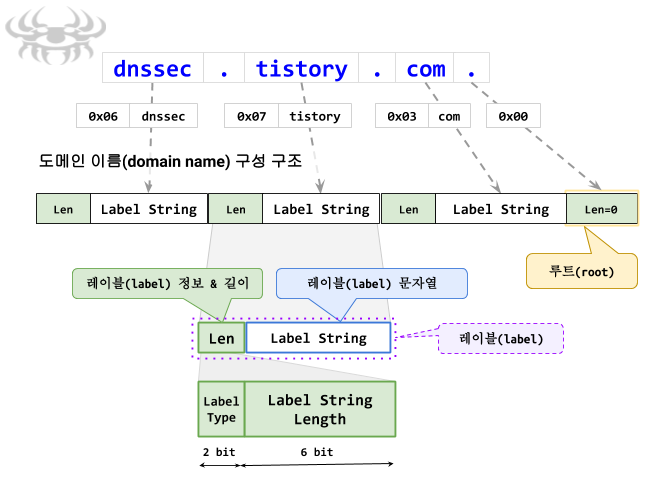 도메인 이름은 점으로 구분한 레이블의 연속이라고 할 수 있다. RFC1034에서 정리한 내용에 따르면, 도메인은 루트 노드를 기준으로 하여 각 계층을 온점(.)으로 연결한 형태로 표기하며, 각 온점 사이의 문자열은 레이블(Label)로 명명하도록 정의되어 있다. 전체 도메인에 대한 크기는 255byte이며, 하나의 레이블 당 최대 63바이트 크기를 갖는다.