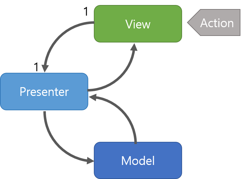View와 Presenter가 1:1 관계라 의존성이 커진다. 오직 Presenter를 통해 상태나 변화를 알려준다.