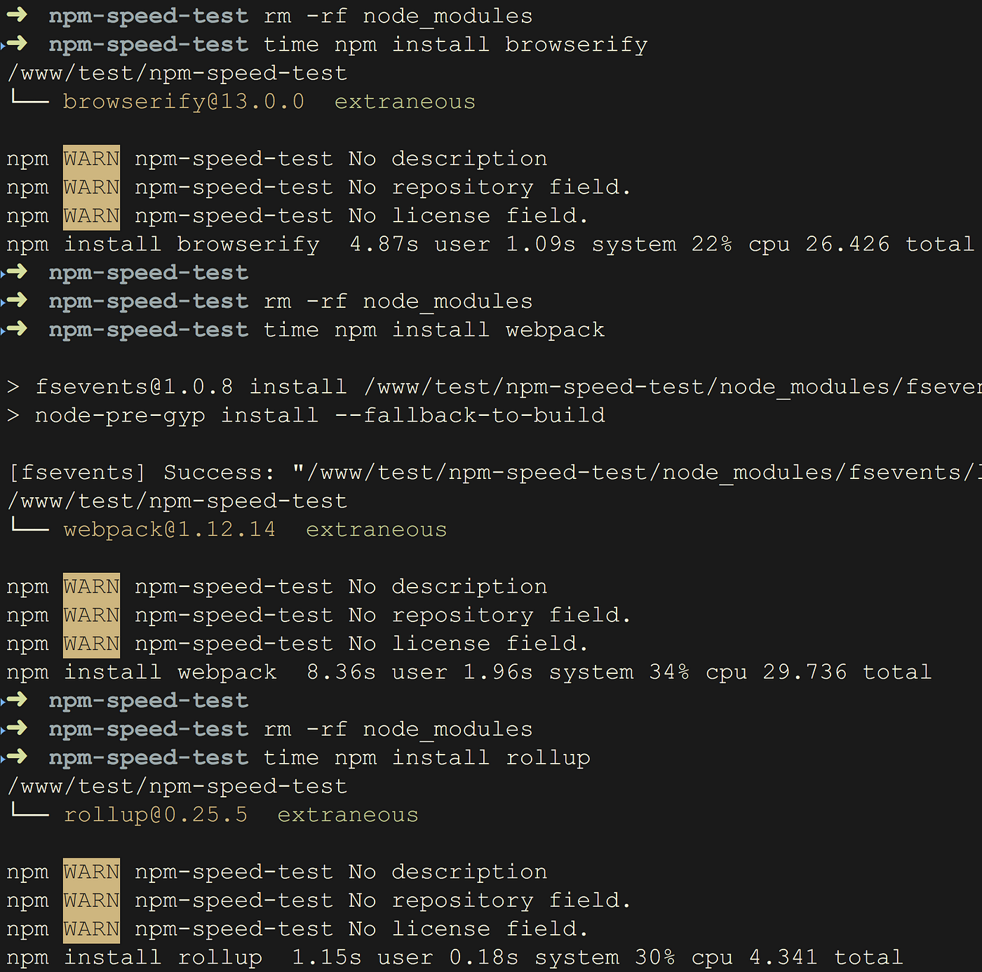 비과학적인 테스트로 대략 비슷한 기능을 하는 세 패키지, Rollup, Webpack, Browserfy를 예로 각각을 새로 설치하는 데 시간이 얼마나 걸릴까요?