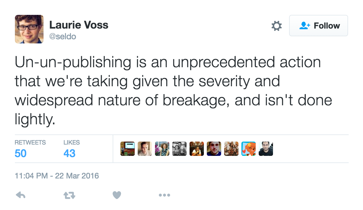 On March 22, 2016...npm left-pad incident