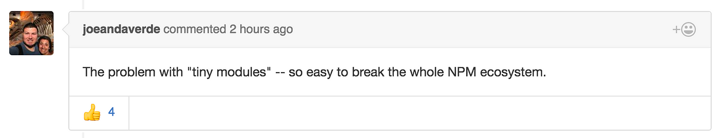 Javascript 생태계의 특징, 작은 기능들이 모듈화 된 소프트웨어의 구조를 실감하게 된 사건으로 느껴진다. 이 사건은 굉장히 파장이 컸던 만큼 개발자들의 각기 다른 의견과 감정적인 말들이 오고 갔는데, 그 중 Rollup의 창시자 Rich Harris의 글을 같이 보았으면 한다. 그의 글은 left-pad의 사건을 요약해주고 해당 사건을 방지할 수 있는 방법까지 제시한다. 아래부터 해리스의 글이다. 👀