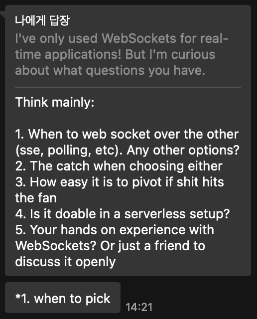 WebSocket을 사용한 실무 경험이 있는가? 아니면 그냥 이런 주제를 편하게 이야기할 친구가 필요한가?