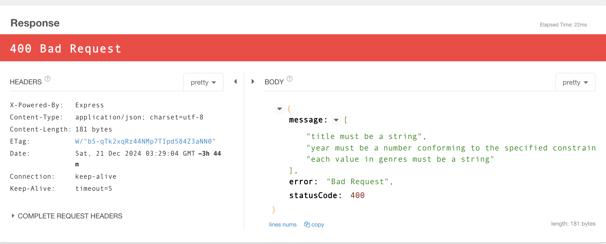 만약 이 규칙이 적용되고 Request Body에 잘못된 속성이 포함된 요청이 들어오게 되면 자동으로 400 Bad Request로 응답한다.