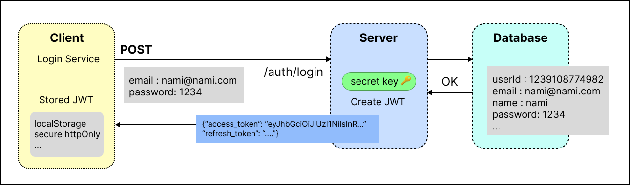 JWT의 경우 클라이언트가 서버에 첫 로그인 인증을 보내면, 서버에서 응답으로 Access Token과 Refresh Token을 담아서 보낸다.