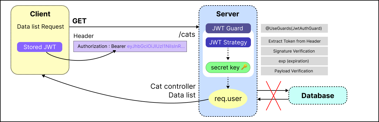 Header에서 Token 추출 ➡️ Secret key를 통한 Signature 검증 ➡️ Token exp 여부 확인 ➡️ Payload에서 사용자 정보 추출 후 req.user에 저장