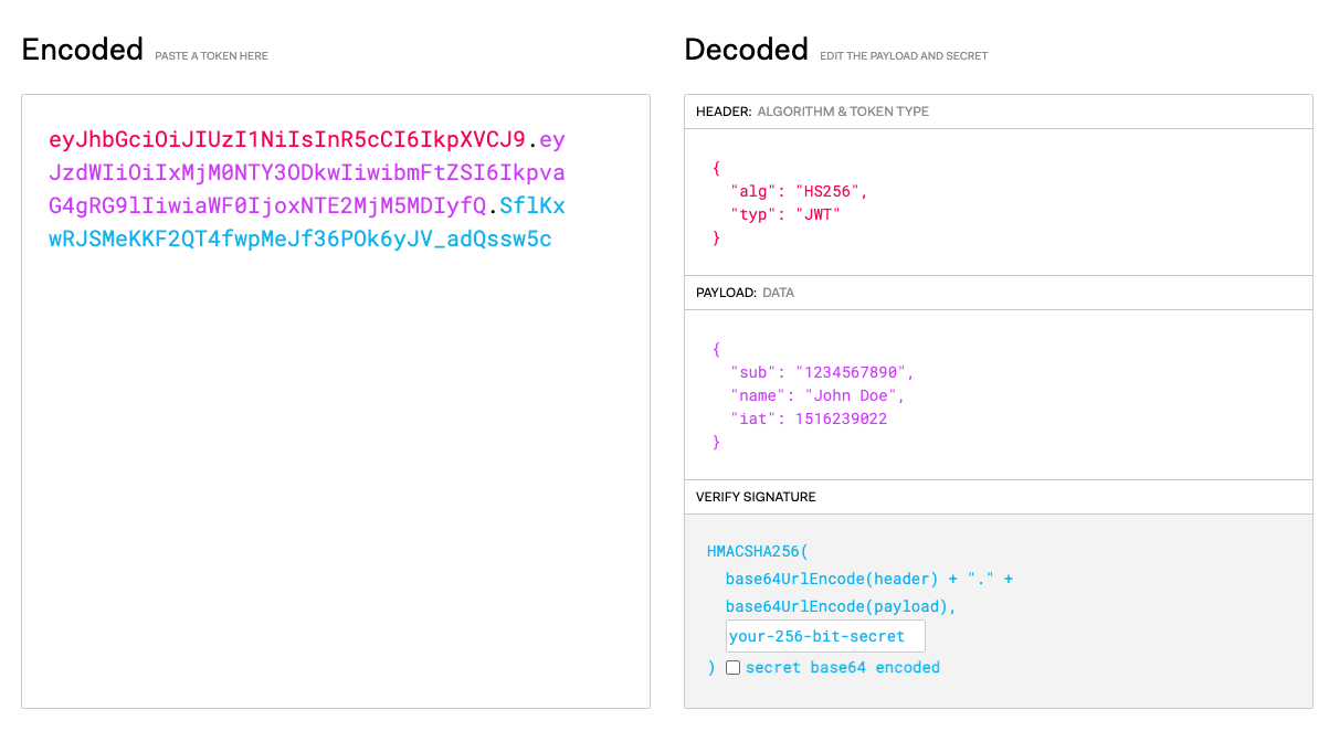 HS256(base64UrlEncode(header) + “.” + base64UrlEncode(payload), Secret key)