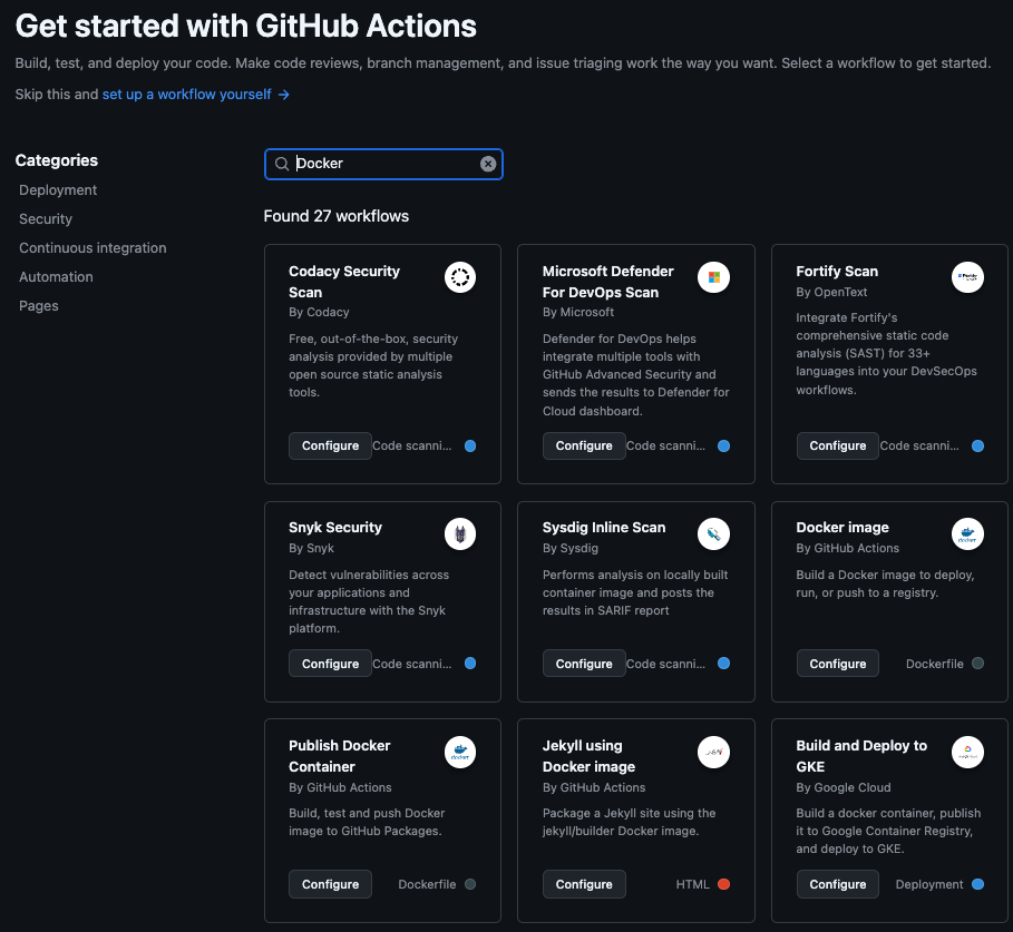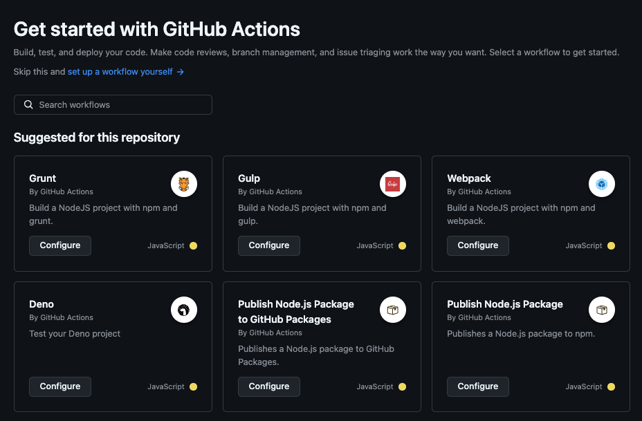 나는 상단에 보이는 set up a workflow yourself -> 를 눌러서 수동으로 등록했다. configure를 눌러서 필요한 부분만 지워도 괜찮음.