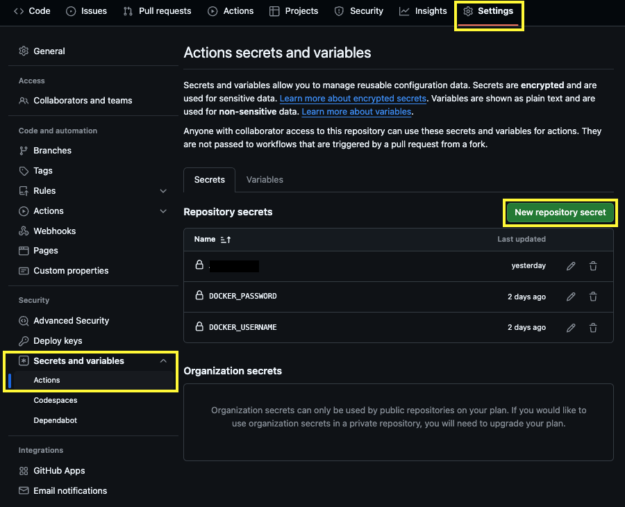 다만 username과 password를 보면 secrets를 사용한 것을 알 수 있다. 자동화 워크플로우에서 DockerHub 로그인 정보나 .env 환경 변수 등을 외부에 노출되면 안되는 민감한 데이터기 때문에 Github 레포 설정에서 Secrets를 따로 설정해주었다.