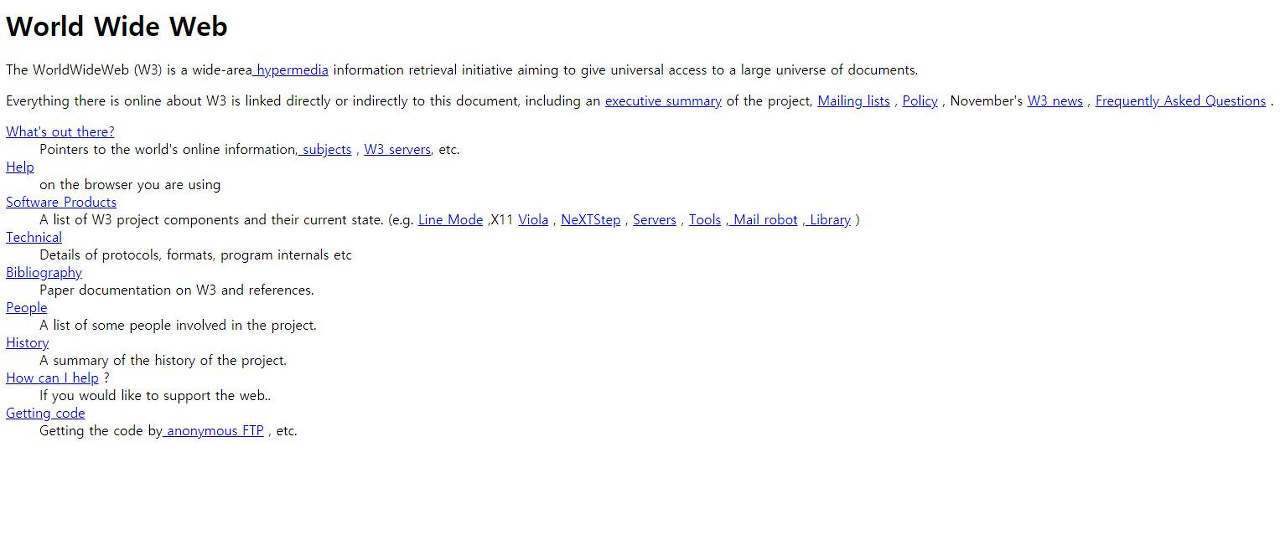 1990년 팀 버너스리는 자신의 컴퓨터와 동료의 컴퓨터에 자신이 개발한 *웹 브라우저를 설치하고 info.cern.ch(세계 최초의 웹사이트)라는 URL을 가진 **웹 서버와 성공적으로 통신을 하였고, 1991년 세계 최초의 웹페이지를 공개했다.